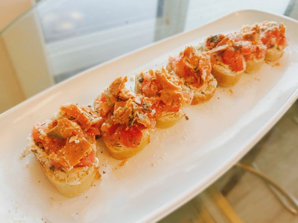 25 Served on a toasted baguette with smoked salmon, diced tomato, onion, garlic balsamic sauce sprinkled with lemon juice and olive oil.